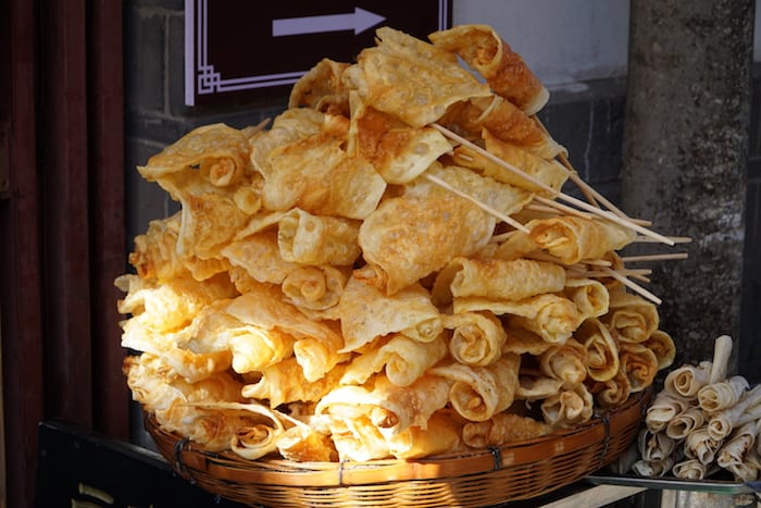 Another great specialty of Yunnan that I recommend stuff your face with if you plan on staying in China for awhile since you’ll rarely find it elsewhere, is goat cheese! Served in two dietary ways, one is a thin burned slice (rubing 乳饼), the other in a fried porous wrap (rushan 乳扇), famous also for its walking around food. The later are a specialty of Dali.