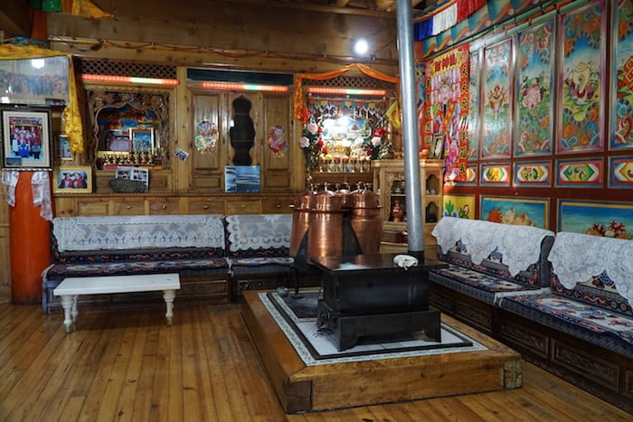 Dejan un poco que desear en cuanto a elegancia arquitectónica, pero aquí no se presta mucha atención a la armonía urbana, prevaleciendo el control de las temperaturas y la distribución del espacio a la manera típica tibetana. La planta baja no es una zona “habitable”, sino más bien una parte del hogar dedicada al trabajo o incluso al ganado. La familia vive en la primera planta, con un gran espacio central climatizado donde se come y se conserva la manteca de yak. Y la TV.