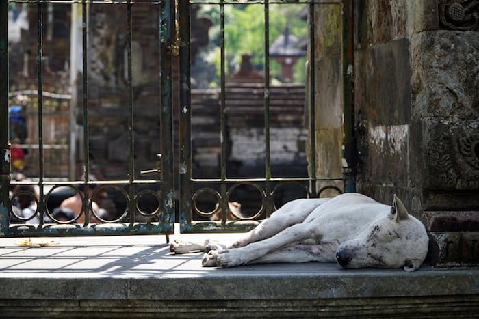 Un cane randagio appisolato al tempio di Tirta Empul – Foto di Matteo Bosi