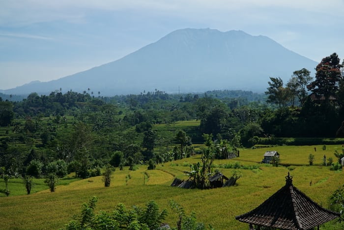 La campagna di Sidemen nell’entroterra di Bali e alle spalle il Monte Agung – Foto di Matteo Bosi