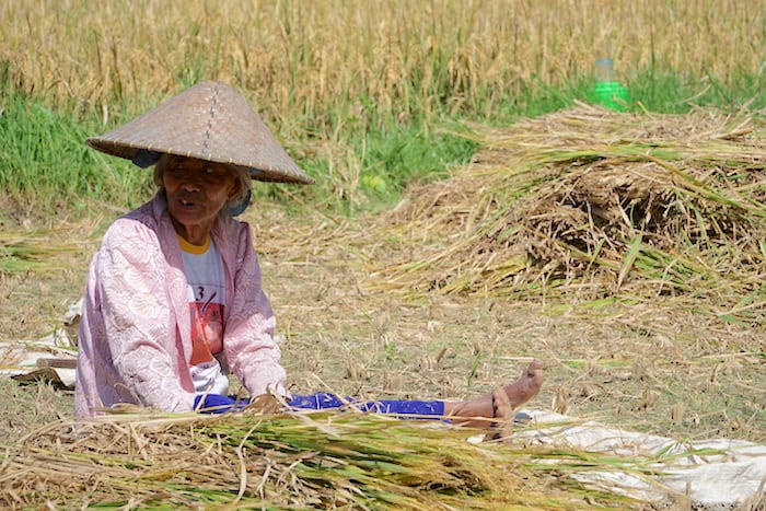 Una anziana signora si riposa durante l’estenuante raccolta manuale del riso – Foto di Matteo Bosi